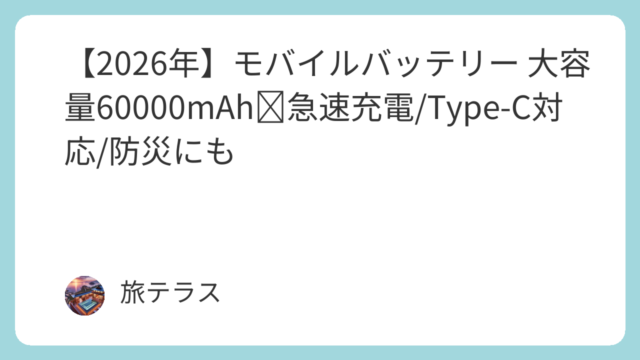 こんにちは、旅テラスです。今回は、大容量モバイルバッテリーの決定版とも言える「モバイルバッテリー 大容量【60000mAh大容量·6台同時に充電·急速充電】モバイルバッテリー 軽量 小型 4つのケーブル内蔵 最大出力2.4A ケーブル内蔵一体型 LCD残量表示 PSE技術認証済 安全回路保護 Type-C入力/出力ポートiOS/Android各種スマホ対応 携帯充電器 スマホ充電器 コンパクト&軽量 旅行/出張/アウトドア/停電/防災緊急用」を徹底的にレビューします!