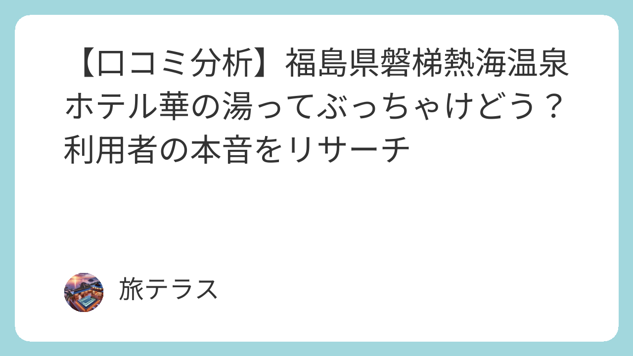 今回は、福島県磐梯熱海温泉にある「ホテル華の湯」について、じっくりとリサーチしてみました。温泉宿を選ぶときって迷いませんか?口コミサイトを見ると賛否両論で、本当のところがよくわからなくなることってありますよね。そんな時こそ、実際の利用者の声から「本当のホテルの姿」が見えてくるんです。