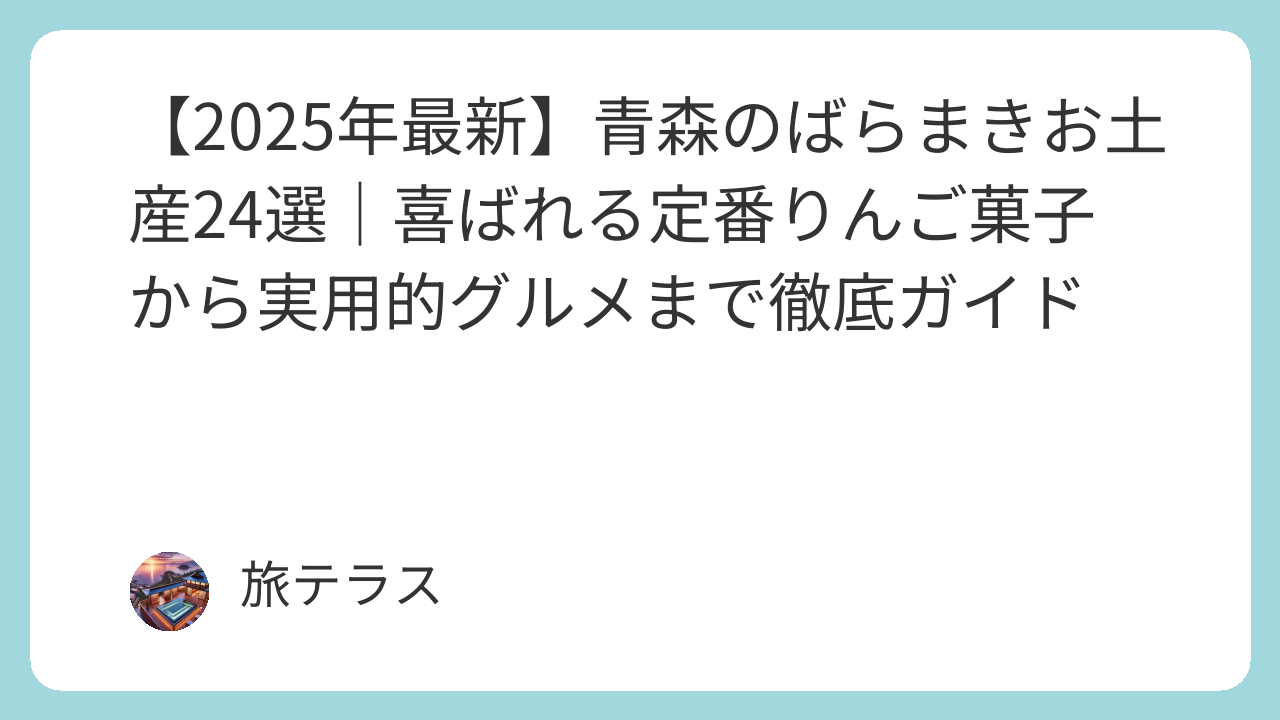 この記事では、青森の玄関口である新青森駅や青森空港、観光物産館などで実際に購入できるアイテムの中から、旅テラスが「これは喜ばれる!」と確信したばらまき用お土産を徹底的にリサーチしました。定番のりんご系スイーツはもちろん、甘いものが苦手な方にも喜ばれる「おつまみ系」や「実用的グルメ」まで、全24種類を厳選してご紹介します。