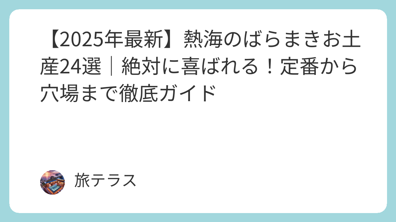こんにちは、プロのブロガー「旅テラス」です。日本有数の温泉地、熱海。美しい海と山の幸に恵まれ、レトロな街並みとモダンなスイーツショップが融合する、魅力あふれる観光地ですよね。旅の締めくくりといえば、やっぱりお土産選び。特に職場や友人に配る「ばらまきお土産」は、センスが問われる重要なミッションです。