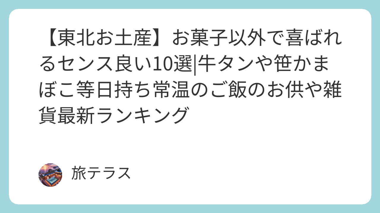 こんにちは、旅テラスです。東北旅行のお土産選び、ついつい定番のお菓子を選びがちですが、「またお菓子?」と思われないか、甘いものが苦手な方や目上の方へ何を贈ればよいか、悩んでしまうことはありませんか。センスが良いと一目置かれるような、気の利いたお土産を見つけるのは案外難しいものです。